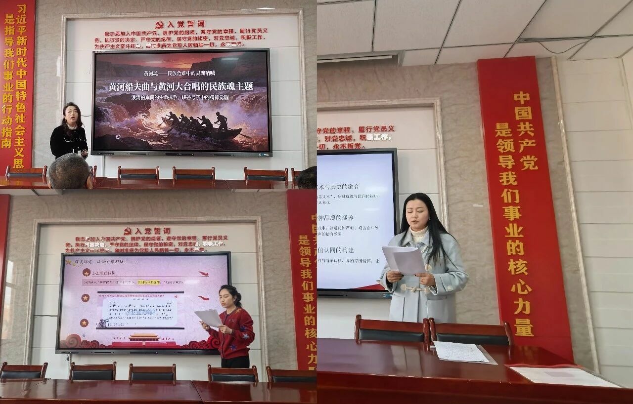 在教学展示环节,新福园中学孙丽丽老师与三迪宏文中学王郁婷老师,分别围绕《黄河船夫曲》与《保卫黄河》进行了精彩的教学设计分享。两位老师从音乐本体分析、历史背景解读、情感价值引导等多维度,详细介绍了如何通过教学实践,引领学生深刻理解作品所承载的民族气节、抗战历史和爱国热情。