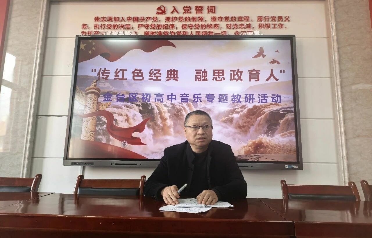 随后,金台高级中学董华老师作了题为《以乐载史 以史育心 打造新时代“大思政课”创新样态》的专题讲座。她结合自身丰富的教学案例,系统阐述了将音乐作品与思想政治教育在中学课堂中有机融合的有效方法与实施路径,为全区音乐教师提供了宝贵的经验借鉴。