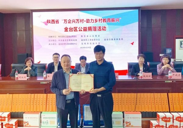 4月19日上午,陕西省“万企兴万村·助力乡村教育振兴”金台区捐赠活动在石油中学举行。区委副书记、区政府区长王润军,格乐公益基金秘书长王鹏,区领导赵玲丽、周红丽、严晓霞、郝伟参加活动。