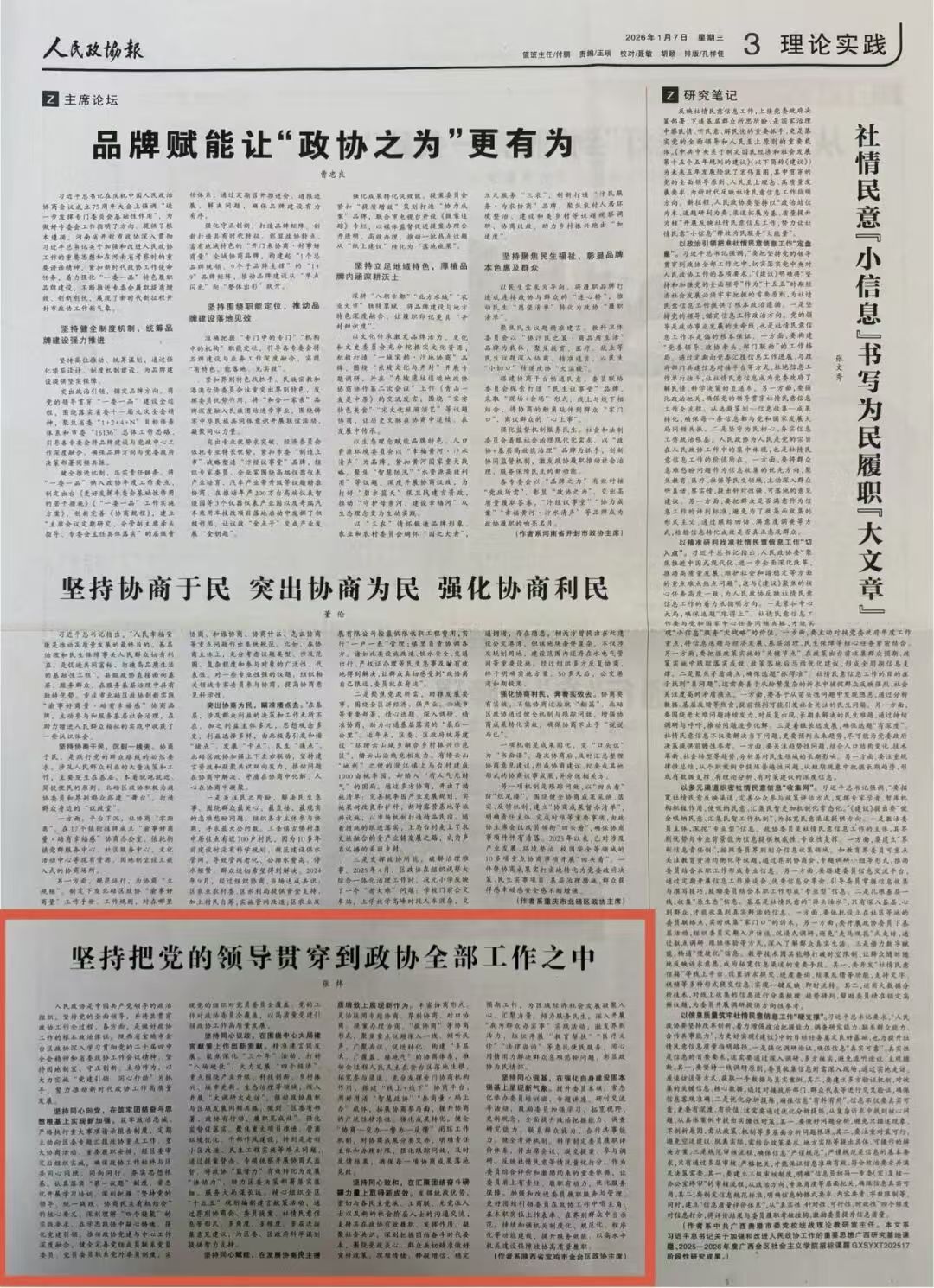 《坚持把党的领导贯穿到政协全部工作之中》《弘扬中华民族优秀传统 积极培育协商民主文化》等四篇理论文章被中国政协、人民政协报、知网刊登交流;