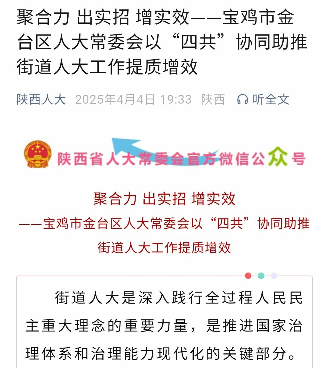街道人大是深入践行全过程人民民主重大理念的重要力量,是推进国家治理体系和治理能力现代化的关键部分。宝鸡市金台区人大常委会始终将提升街道人大工作质效作为常委会重要目标任务及提升监督质效的基础支撑,聚焦“凝聚共识、监督共频、平台共建、课题共研”协同发力,推动国家根本政治制度更加深入人心,人大常委会机关作用发挥更加明显。