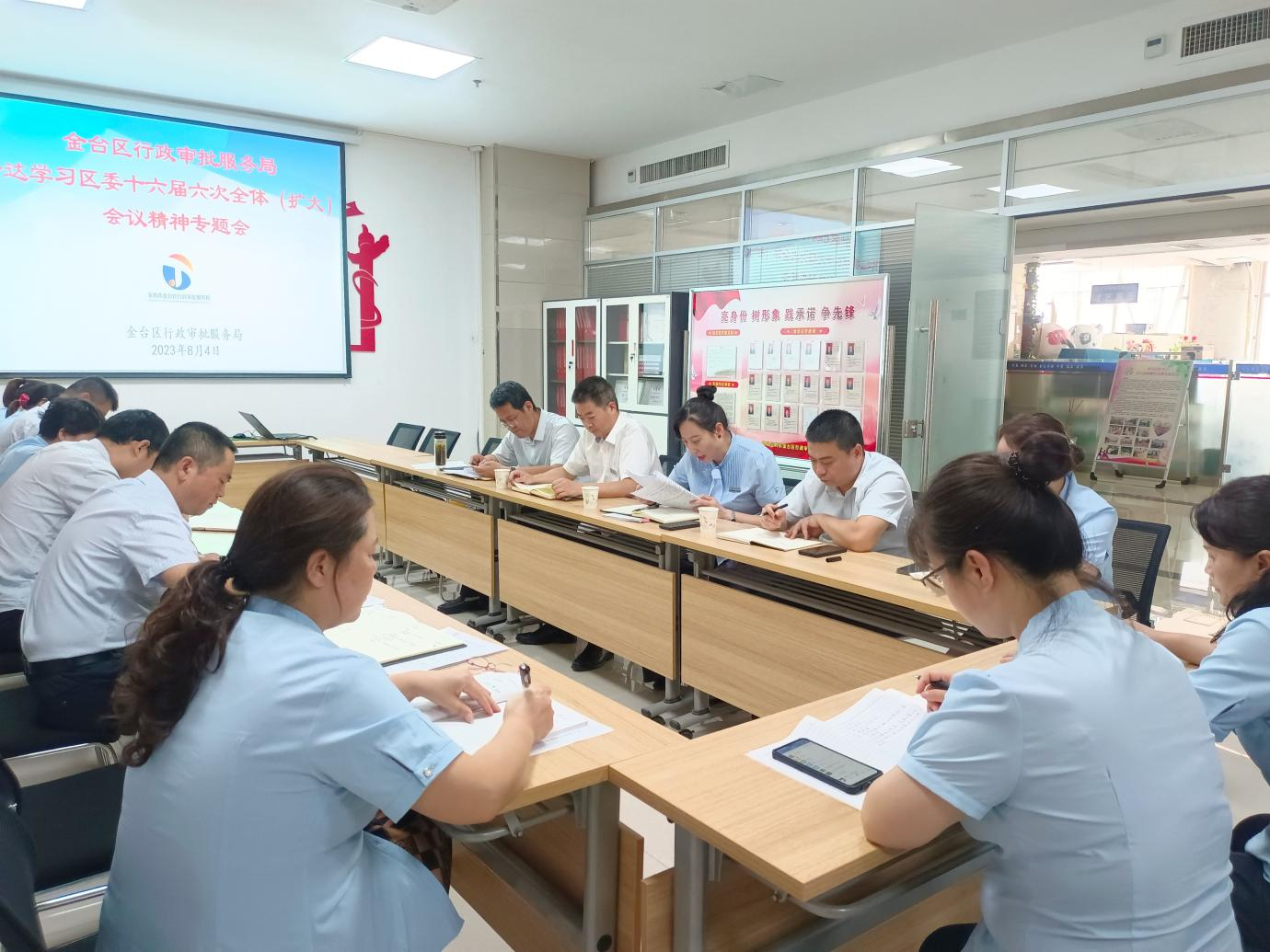 8月4日下午,金台区行政审批服务局召开全体人员会议,专题传达学习中共宝鸡市金台区委第十六届六次全体(扩大)会议精神,局党组成员、副局长李兵主持,局(中心)全体领导干部参加会议。
