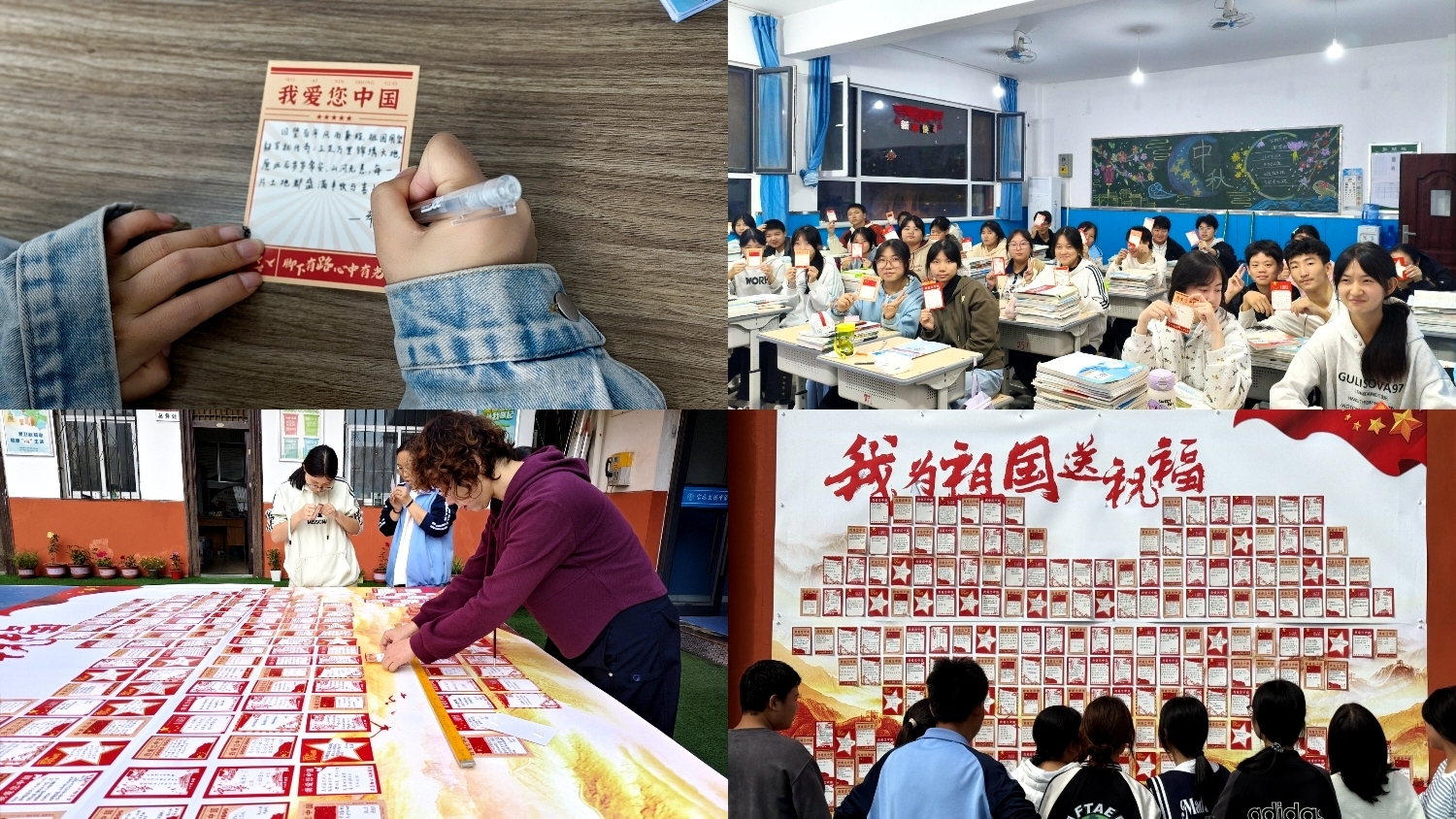 三迪中学教育集团卧龙寺校区、宏文校区全体师生挥舞国旗齐唱爱国歌曲,各楼层师生同步挥旗,“祖国母亲生日快乐”“祖国万岁”的祝福声此起彼伏,共同营造出热烈的节日氛围;文德中学开展《我为祖国送祝福》全校留言活动,师生们写下的祝福话语被整理成可视化的“家国情怀”展示区,成为校园内一道独特的国庆风景线。此外,新福园中学、金河尚居小学、宝平路小学、代家湾小学、大庆路小学等多所校园还通过拍摄视频的形式致敬祖国,共同祝福祖国76周年华诞。