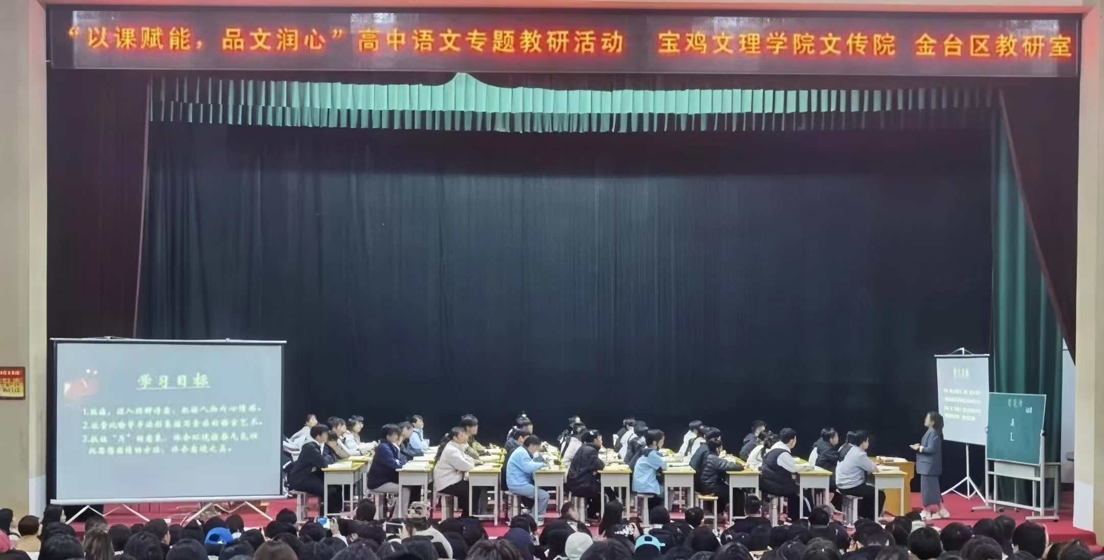 近日,金台区"以课赋能,品文润心"高中语文专题研讨活动举办。本次活动由宝鸡文理学院与金台区教研室主办,金台高级中学承办,宝鸡文理学院文学与新闻传播学院师生、天王高中语文教研组代表及金台区各高一语文教师等400余人参加活动。