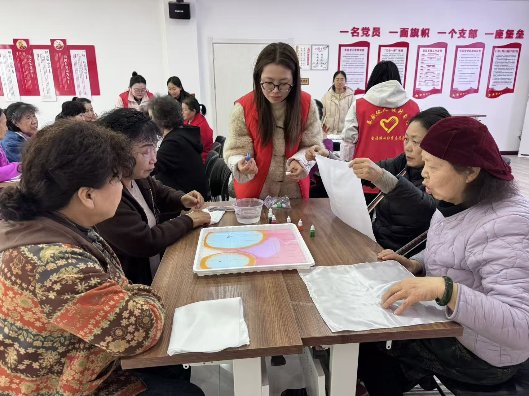 在“三八”妇女节来临之际,为丰富辖区妇女同胞们的精神文化生活,宝福路西社区新时代文明实践站组织开展了“丝柔雅韵 妙染芳华”——非遗水拓丝巾手作妇女节活动。
