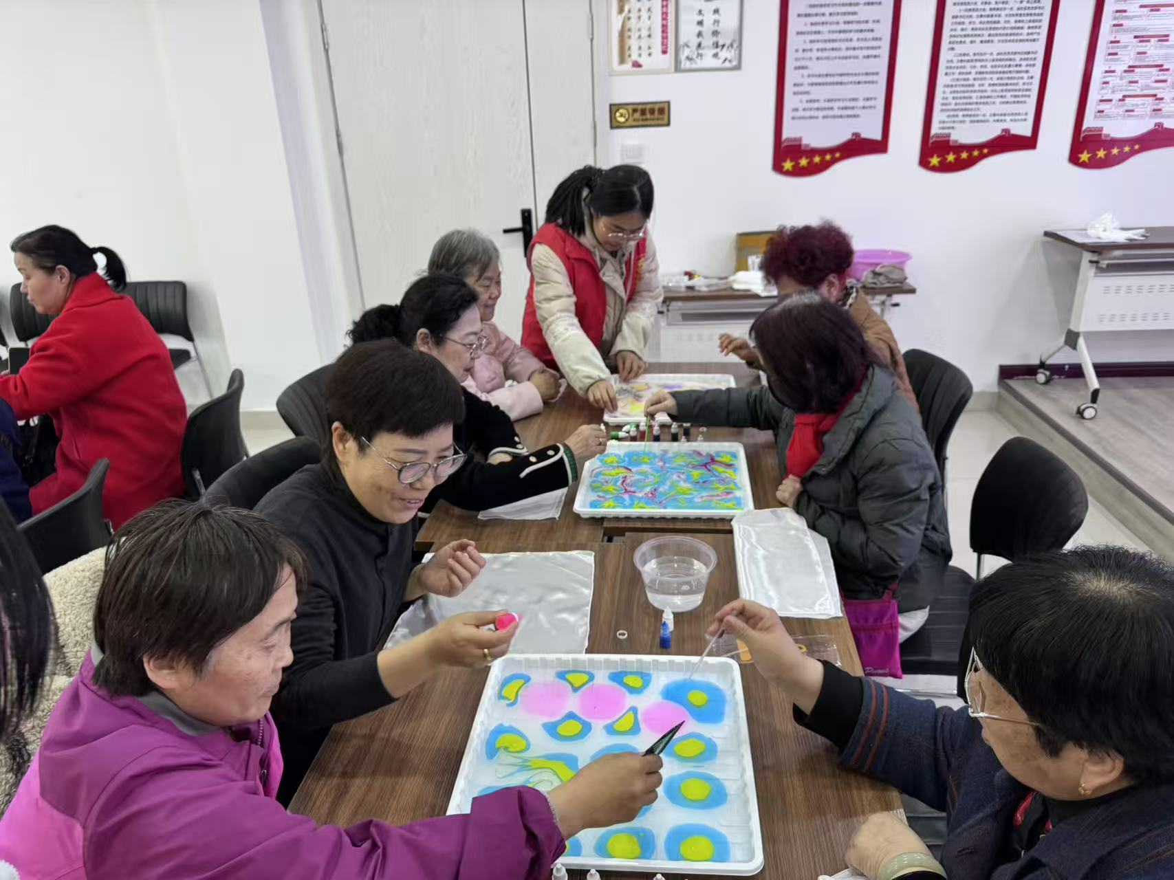 活动伊始,社区工作人员向大家送去妇女节的节日祝福,并介绍了本次水拓丝巾的制作方法及注意事项。阿姨们在工作人员的指导下,将调配好的颜料滴入水中,颜料在水面上自然晕染开来,形成五彩斑斓的图案。随后,用工具轻轻拨动水面,让颜料自由流动,创造出独一无二的纹路。最后,将丝巾轻轻覆盖在水面上,颜料便神奇地拓印到了丝巾上。每个人都收获了一条专属于自己的,独一无二的水拓丝巾。
