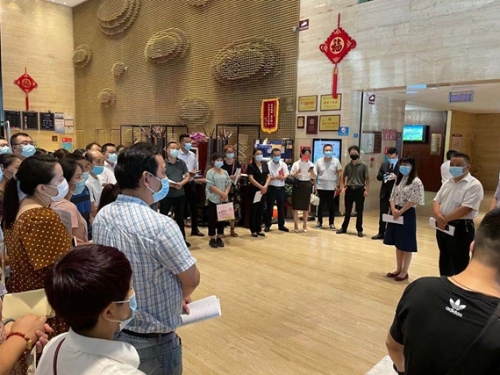 7月29日下午,区商务局组织召开商贸行业疫情防控和创文工作现场推进会。辖区56家商场超市、宾馆酒店负责人现场观摩了大庆路恒源酒店、华润万家超市的疫情防控和全国文明城市创建工作开展情况。区商务局再次对疫情防控和创文工作进行了全面部署安排,区创文办领导出席指导会议,并对下步工作提出明确要求。