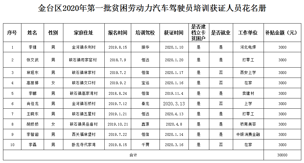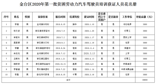 金台区2020年第一批贫困劳动力汽车驾驶员培训获证补贴人员公示期(2020年4月30日至2020年5月9日)已满。现将名单公告如下: